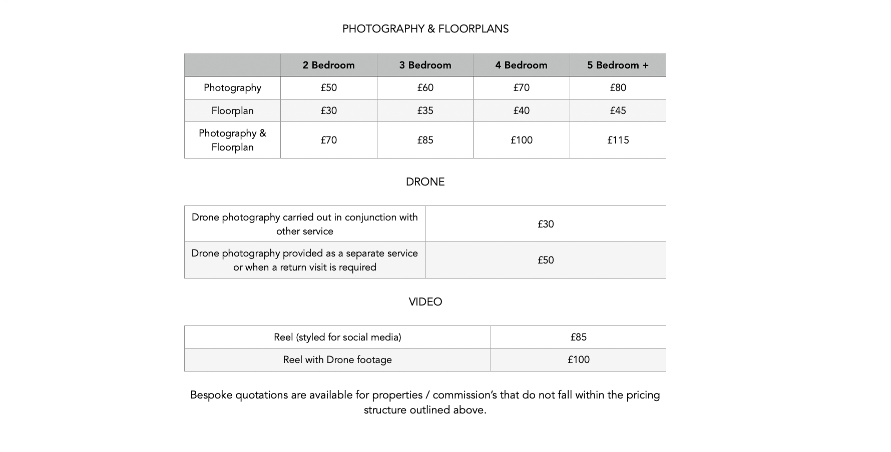 - All drone operations are subject to suitable weather conditions and cannot be carried out in rain or high winds. If a scheduled drone shoot, booked alongside other services, is cancelled due to adverse weather, the final images will be charged at the standalone drone photography rate. Ground-level external images can be taken during the same visit at no extra cost if conditions were wet previously, if requested.